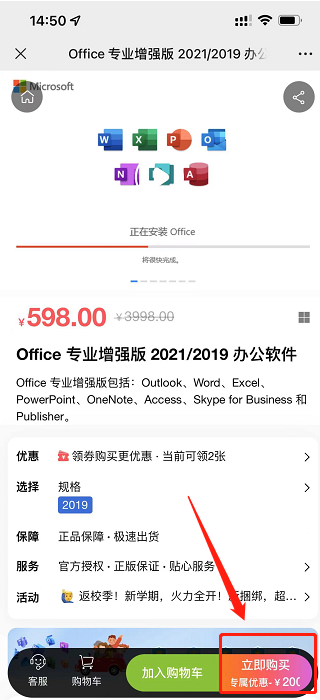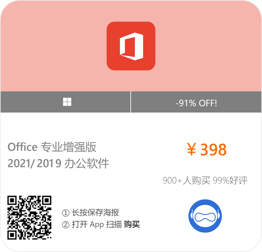 长按下方图片识别二维码后即可进入购买界面,立减200元,Office 2019 专业增强版终身授权版仅需398元,Office 2021 专业增强版终身授权版仅需498元,一次购买终身享用!