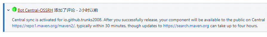 接着看下面一段,根据构建配置,第一个组件可能会在成功部署(deploy)后自动发布(release)。如果发生这种情况,那么我们会收到一条消息,来确认我们的jar包被同步到了maven中央仓库。