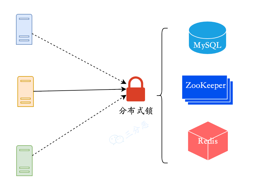 常见的分布式锁实现方案有三种:MySQL分布式锁、ZooKepper分布式锁、Redis分布式锁。