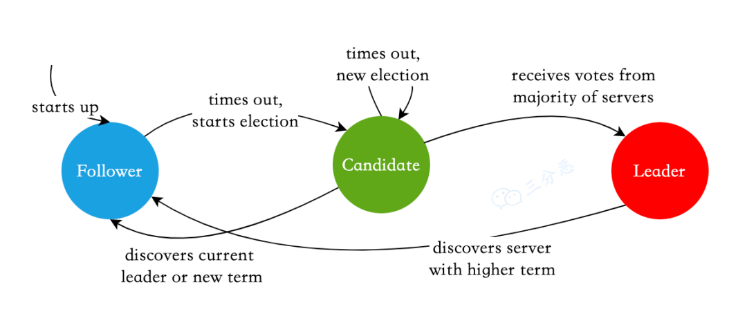那么首先开启一轮大选。在大选期间 所有跟随者 都能参与竞选,这时所有跟随者的角色就变成了 候选人,民主投票选出领袖后就开始了这届领袖的任期,然后选举结束,所有除 领导者 的 候选人 又变回 跟随者 服从领导者领导。