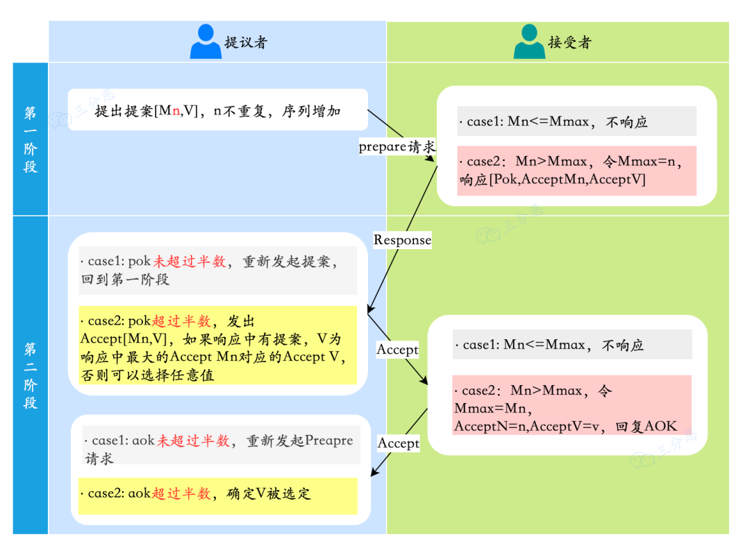 Paxos算法包含两个阶段,第一阶段**Prepare(准备)、第二阶段Accept(接受)**。