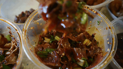 切牛肉、倒切好的牛肉、拌肺片、收钱每个岗位都有专门负责的人,师父手速超级快,十几秒一份就拌好了。