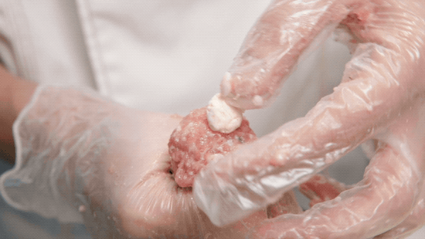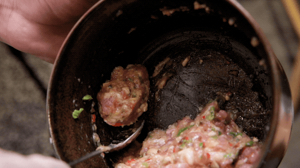 小哥哥当到你的面把蛋液、肉糜、选的肉丸子材料伙到一起,制成肉丸子下锅。