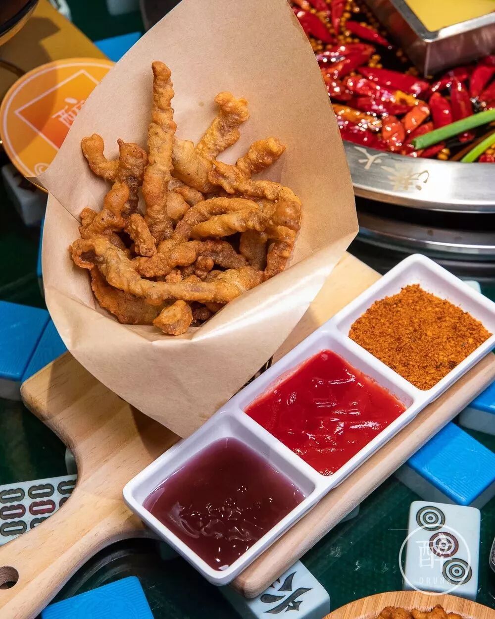 有一部分桌子也很有意思,用一整付麻将垫底,确认过眼神,是四川人好的那个「味道」。