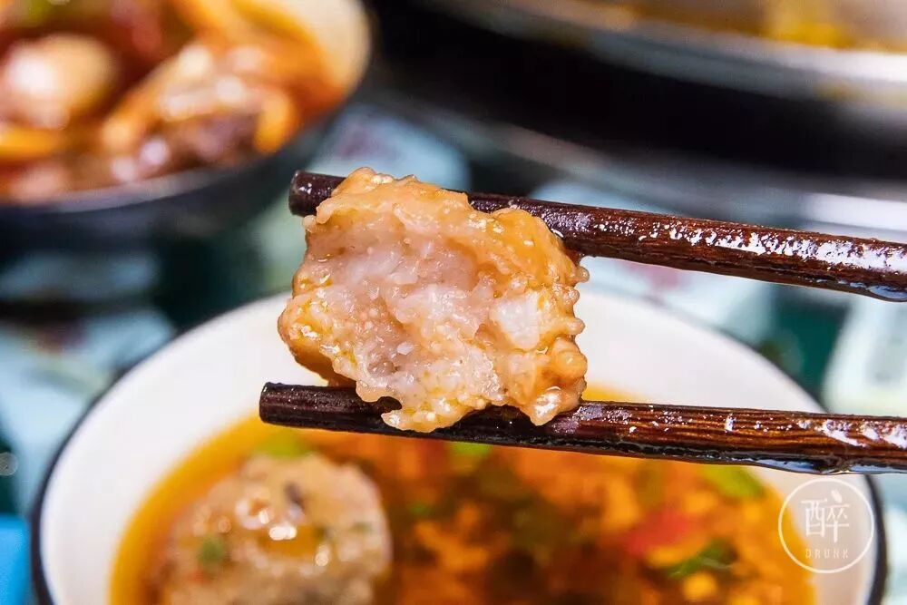 马蹄最特别,成都本地人喊的「cigua儿」,新鲜的削皮再宰成小块,跟丸子伙到一起。
