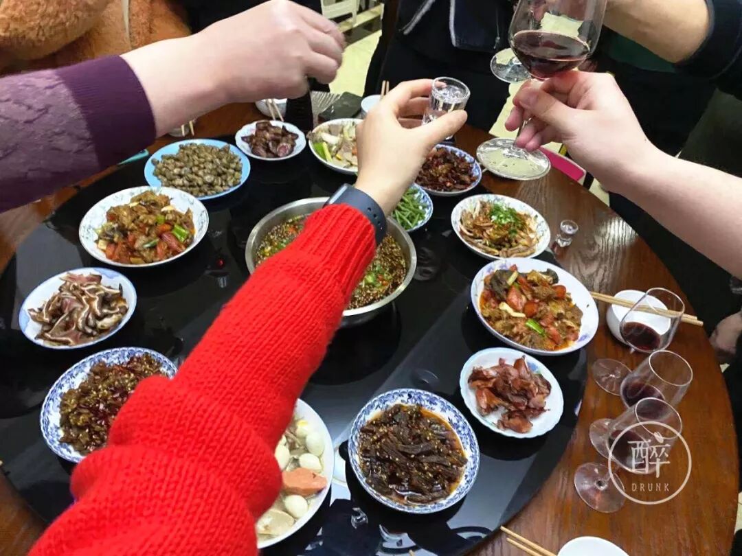 特地穿了过年的红衣服,跟家里人喝酒的感受是:「(此处省略一句脏话),都比我能喝。」