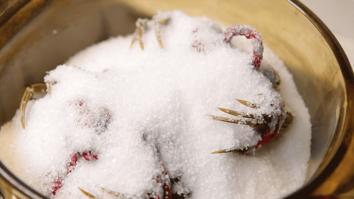 舀出一半的的盐(最好把花椒都挑起来,不然一会儿可能会烧糊),肚皮朝上放入大闸蟹。