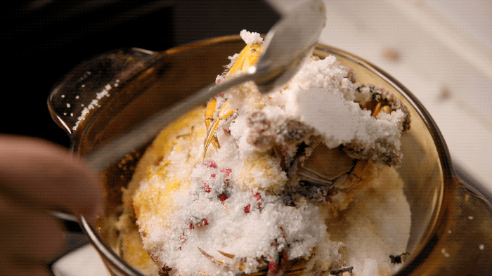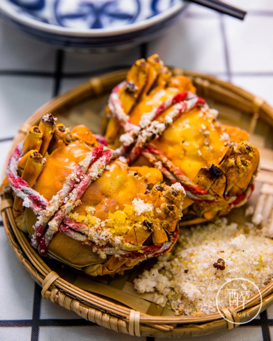 焗出来的大闸蟹,蟹肉在海盐的加持下风味更突出。