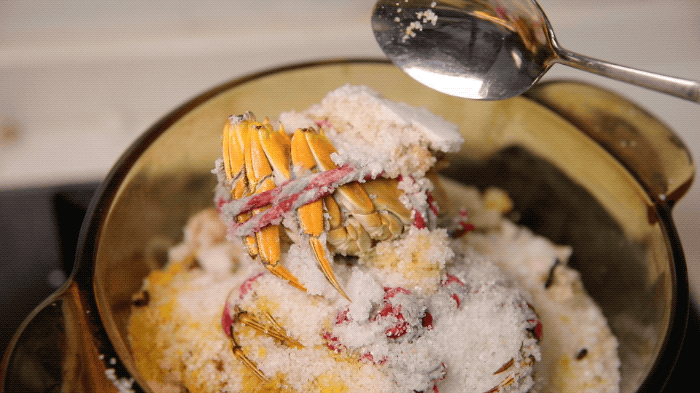 刚焗好的大闸蟹非常烫,用勺子把巴到蟹上面的盐都敲掉。