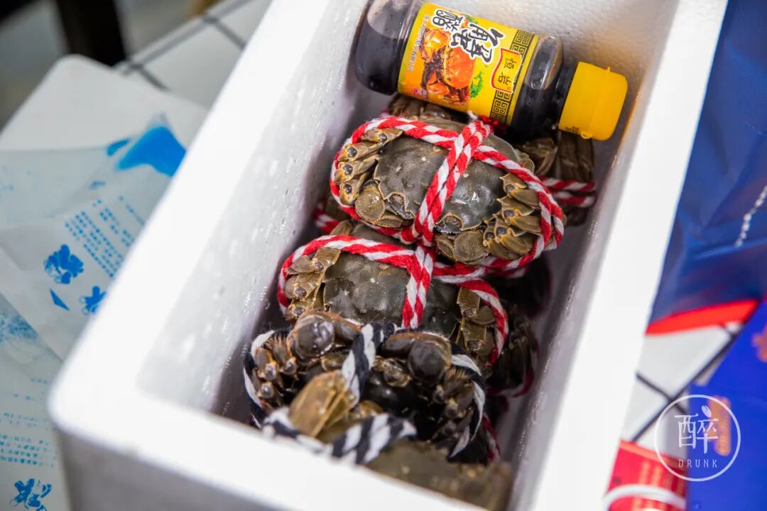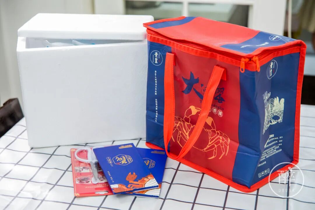 包装也是保温袋+泡沫箱子+冰袋+螃蟹+蟹醋+工具的一整套搭配。