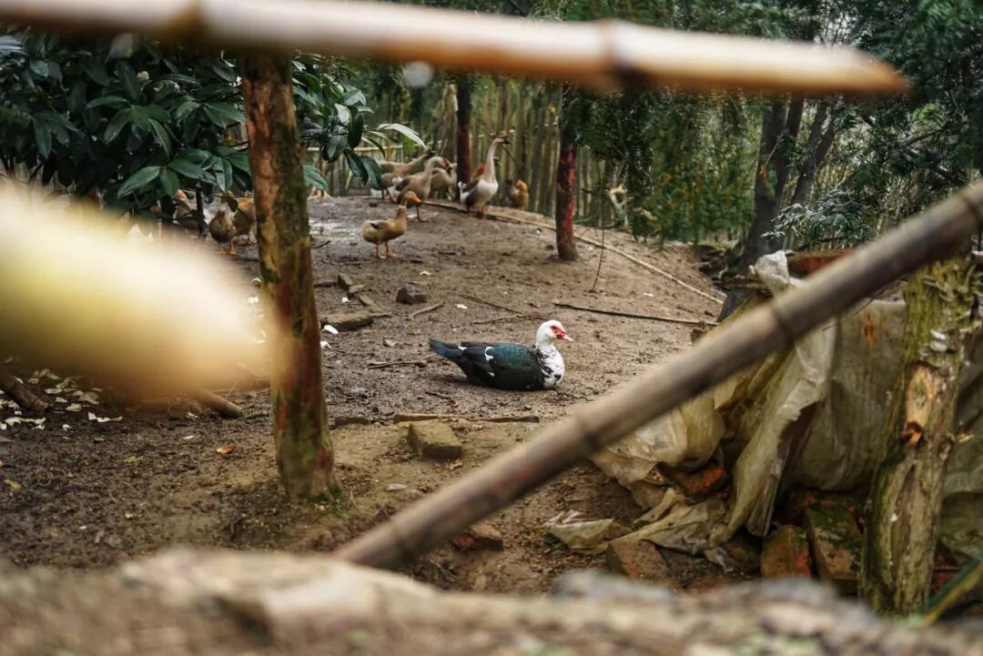 山林间的小镇屋舍俨然,老伯正在修剪门前的枇杷树。山泉溪流里有活蹦乱跳的鱼虾,屋门口有鸡鸭家禽随意啄食。
