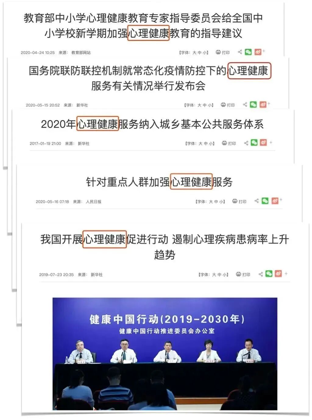 “健康中国行动”(2019-2030)新闻发布会中提到:心理健康促进行动,倡导个人和家庭采取维护心理健康的措施,包括提高心理健康意识,号召公众正确认识心理健康问题,树立“每个人是自己心理健康第一责任人”意识,此外还应使用科学的方法缓解压力等。