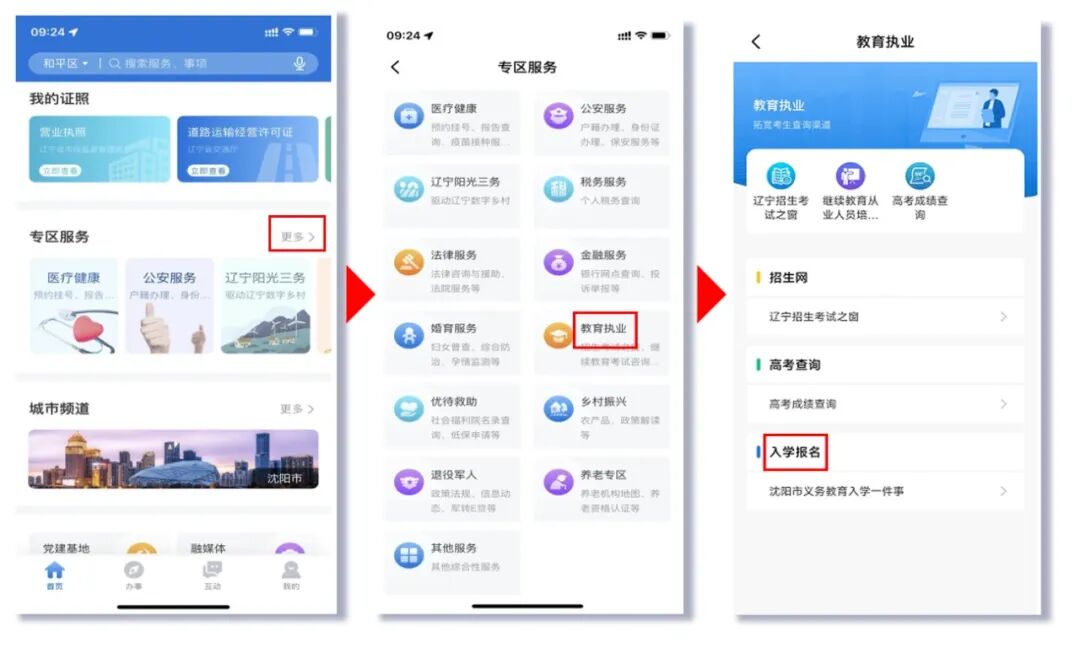 “辽事通”APP:首页-“专区服务”(更多)-“教育执业”-“入学报名”-“沈阳市义务教育入学一件事”,进入“沈阳市小学新生普查报名”。