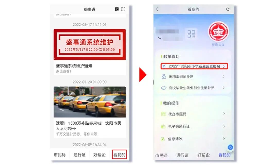 “盛事通”APP:“看我的”-“政策直达”-“2022年沈阳市小学新生普查报名”。