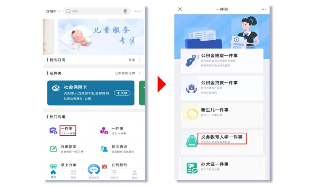 “沈阳政务服务”APP:热门应用-“一件事”(个人一件事)-“义务教育入学一件事”(沈阳市小学新生普查报名)。