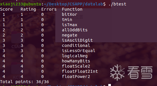 用给定的运算符实现函数的功能,解压得到源码之后在 bits.c 中编写自己的代码,然后要查看结果可以使用如下命令: