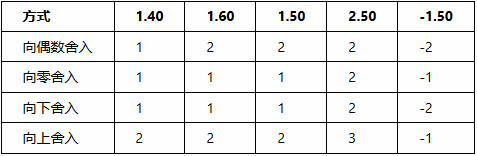 后面三个方式还好,应该都能理解,主要是这个向偶数舍入,它首先满足:被舍入的值不超过最小单位的一半则丢弃,若超过一半则加上一个最小单位,若等于一半则一定会使得舍入的结果为偶数个最小计量单位。
