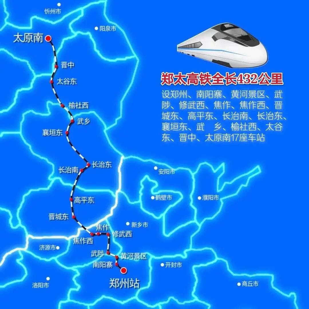 郑州至太原高速铁路是首条纵贯太行山的高铁,线路南起河南省会郑州市,途经河南省焦作市,山西省晋城市、长治市、晋中市,终至山西省会太原市。线路全长432公里,最高设计时速250公里。