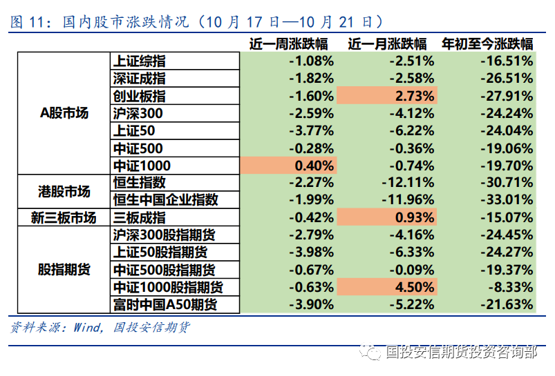 10月17日—10月21日当周,国内稳增长政策仍在持续发力,投资者风险偏好有所降温。股市商品回落,债市偏强运行。综合来看,债>股>商品。