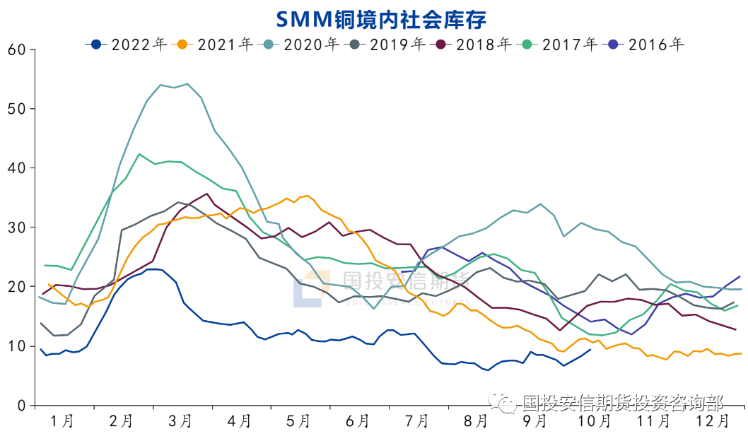 随着市场对于加息预期的修正,美元回落明显减轻了铜市的压制力量,叠加现货紧张的现实库存状态,外盘铜价明显反弹。但仍然需要注意反弹中的几个隐忧:一是人民币汇率波动将明显对冲铜价波动,由于本轮宏观驱动来自美联储,美元回落过程中人民币升值将导致内盘铜价涨幅明显低于海外铜价涨幅;二是可能的宏观交易逻辑切换,市场在短期会反映美联储放缓加息带来的流动性缓解,但货币政策只是对实际经济运行状态的应对,市场的真实情形是欧美经济放缓甚至步入衰退,而相应的国内出口也将受到拖累,需求不足将打压铜市场定价基准;三是现货供应紧张状态的缓解,在10月我们看到全球性的低库存,国内外双升水格局,国内库存过低导致需要去保税库、国际铜库存拉货,但随着季节性补库的到来,随着国内冶炼厂延续高产能水平生产,以及外需削弱带来的短期供应过剩,库存累积将成为多头的负担。
