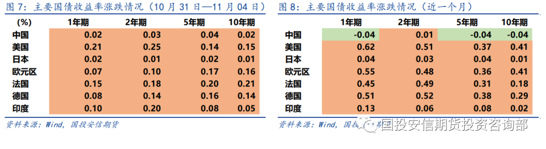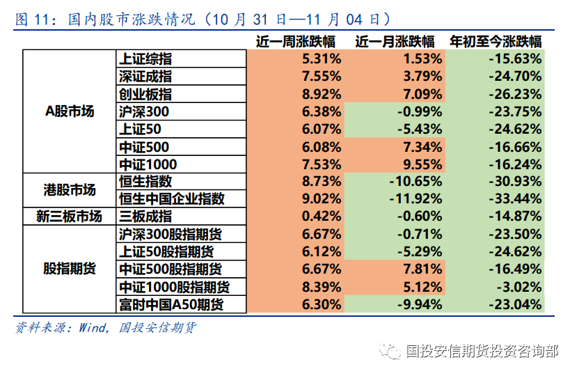 10月31日—11月04日当周,国家统计局数据显示,中国10月制造业PMI为49.2%,较上一个月下降0.9个百分点,从分项看,生产及需求均有所放缓,落入收缩区间;中国10月非制造业商务活动指数为48.7%,较上一个月下降1.9个百分点。中国10月财新制造业PMI为49.2%,较上一个月上升1.1个百分点,中国10月财新服务业PMI为 48.4%,较上一个月下降0.9个百分点。整体来看,制造业有边际改善迹象,服务业改善相对缓慢。投资者风险偏好回暖。股市商品上涨,债市偏弱运行。综合来看,股>商品>债。