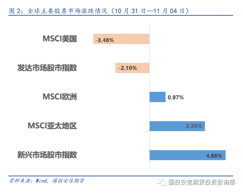 10月31日—11月04日当周,美联储维持偏鹰派立场。主要股票市场涨跌互现。从地域来看,亚太地区涨幅居前;欧股维持周度涨势,表现偏积极;美股整体明显回落。新兴市场表现好于发达市场。VIX指数周度持续回落。