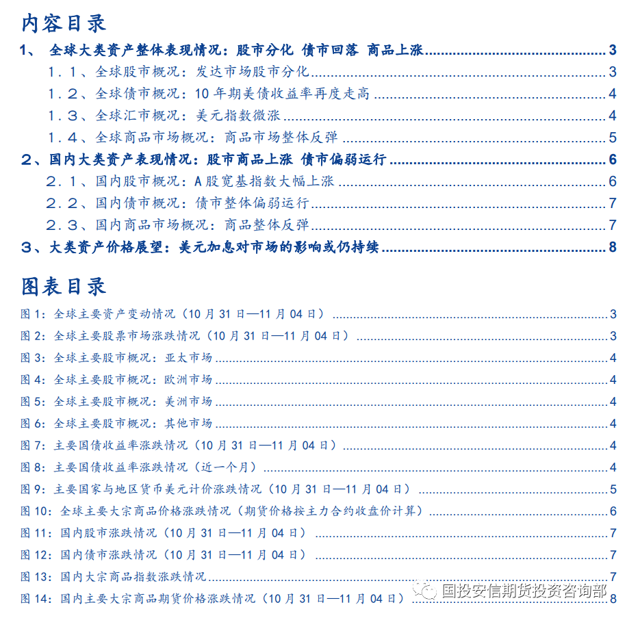1、全球大类资产整体表现情况:股市分化 债市回落 商品上涨