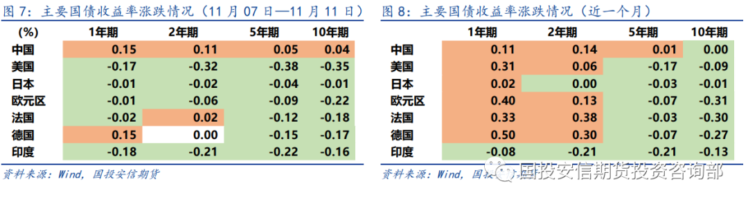 11月07日—11月11日当周,美国通胀数据回落,叠加美联储官员们在加息节奏上的分歧有所加大。中长端美债收益率明显下行,10年期美债收益率周度回落35bp至3.82%。全球债市上涨。除中国外,主要国家10年期国债收益率普遍回落。
