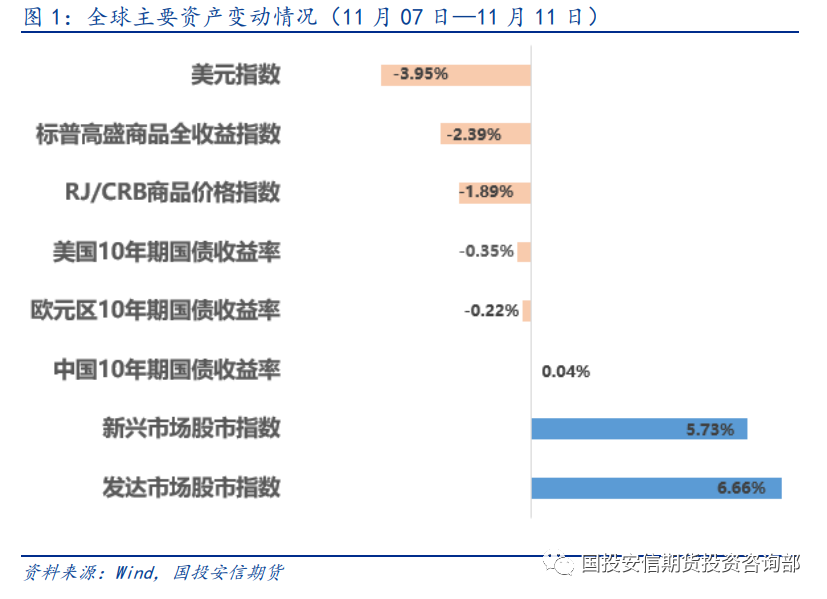 11月07日—11月11日当周,10月美国CPI同比回落超出市场预期,美元加息预期降温。美元指数及10年期美债收益率明显回落。股债上涨,整体商品价格有所回落。综合来看,以美元计价,股>债>商品。