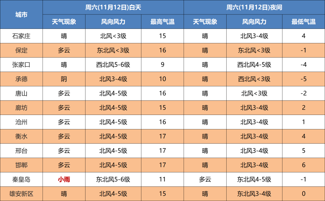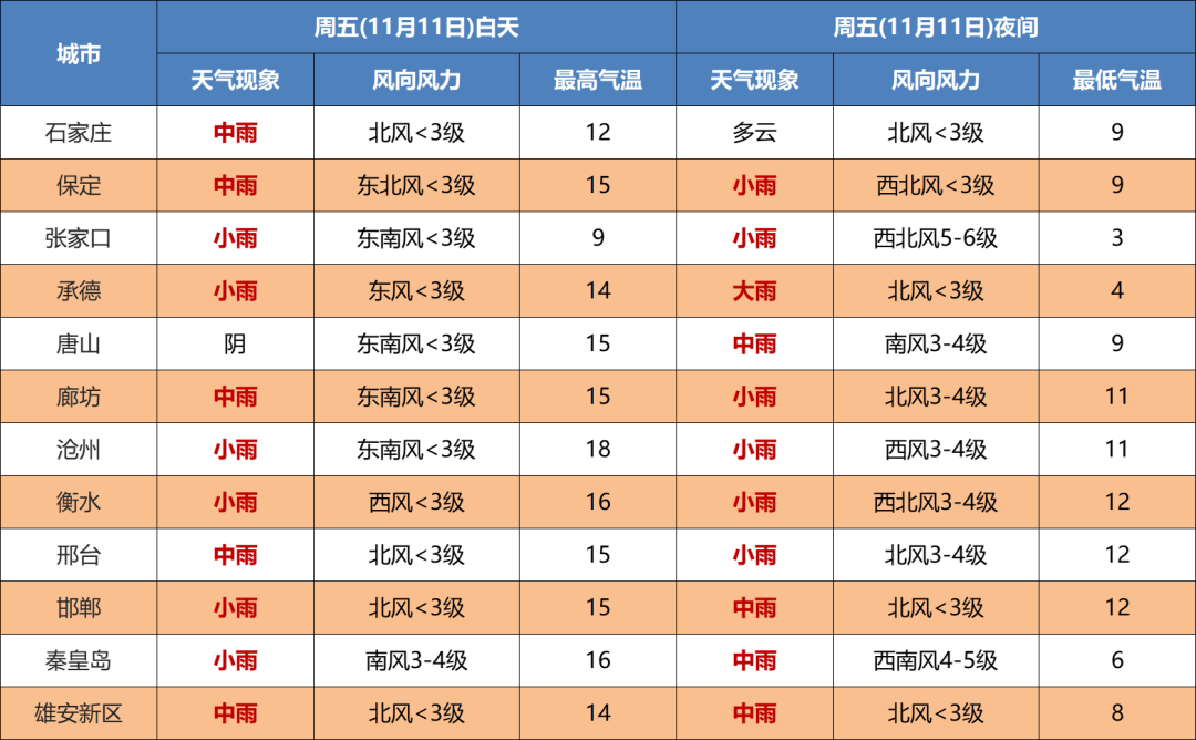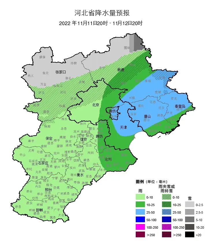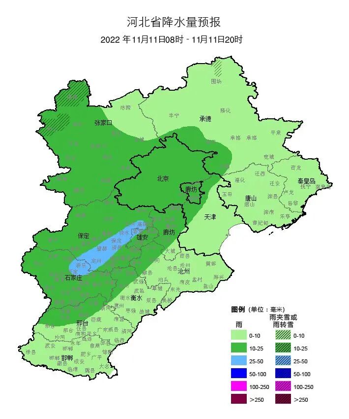 明天夜间到12日,全省阴,承德东部、唐山、秦皇岛、廊坊北部有中雨,局地有大雨,张家口、承德中北部有小到中雨转雨夹雪或小到中雪,其他地区有小雨到中雨。