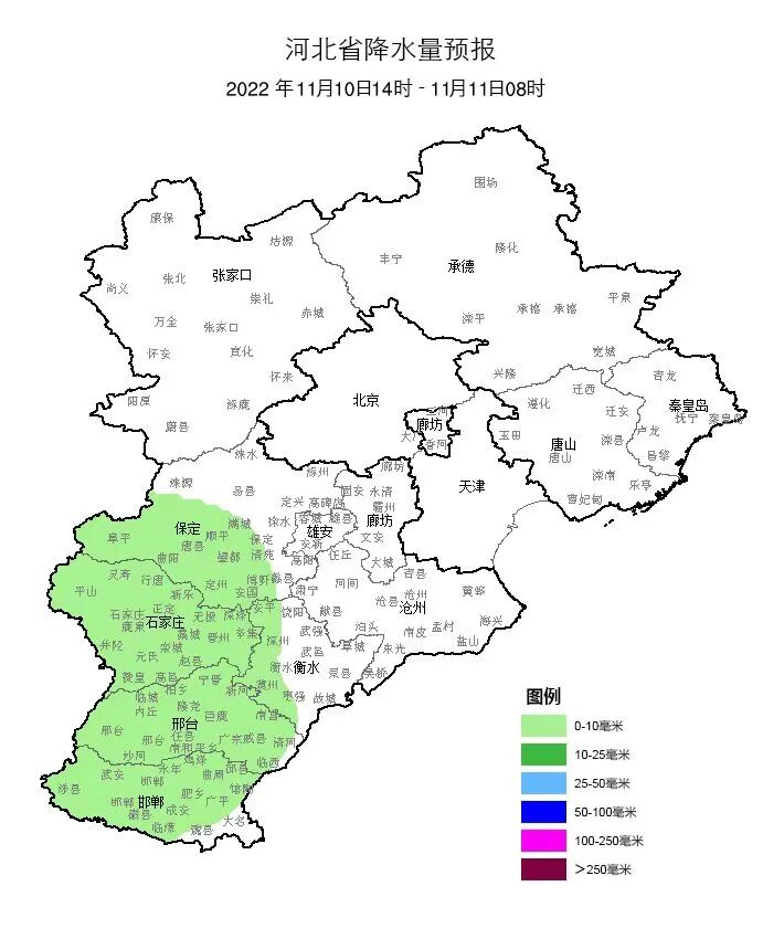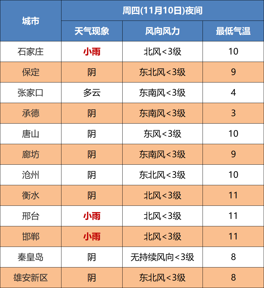 今天下午到夜间,全省多云转阴,保定中西部、石家庄、衡水西部、邢台、邯郸有小雨。