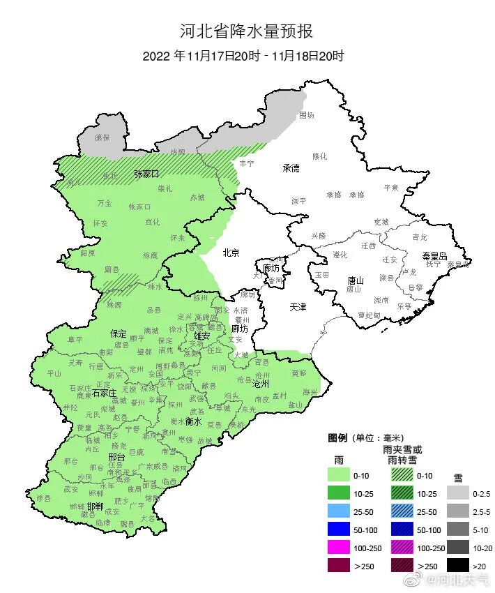 明天夜间到18日,张家口北部、承德北部多云转阴有雨夹雪或小雪,承德南部、唐山、秦皇岛多云转阴,其他地区阴有小雨或零星小雨。