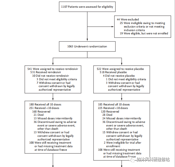 总共1063名患者接受了随机分组。数据和安全监视委员会建议根据一项分析发现的结果,尽早取消这些结果,该结果表明瑞德昔韦组的恢复时间缩短了。初步结果来自1059名患者(538名被分配给remdesivir安慰剂和521名被给予安慰剂),随机分组后的可用数据表明,接受remdesivir的患者的中位恢复时间为11天(95%置信区间[CI]为9至12),相比之下,接受安慰剂者为15天(95%CI,13至19)(恢复率,1.32;95%CI,1.12至1.55;P <0.001)。KaplanMeier对14天死亡率的估计是瑞德昔韦为7.1%,安慰剂为11.9%(死亡风险比为0.70;95%CI为0.47至1.04)。瑞德昔韦组541例患者中有114例发生了严重不良事件(占21.1%),安慰剂组522例患者中有141例发生了严重不良事件(占27.0%)。