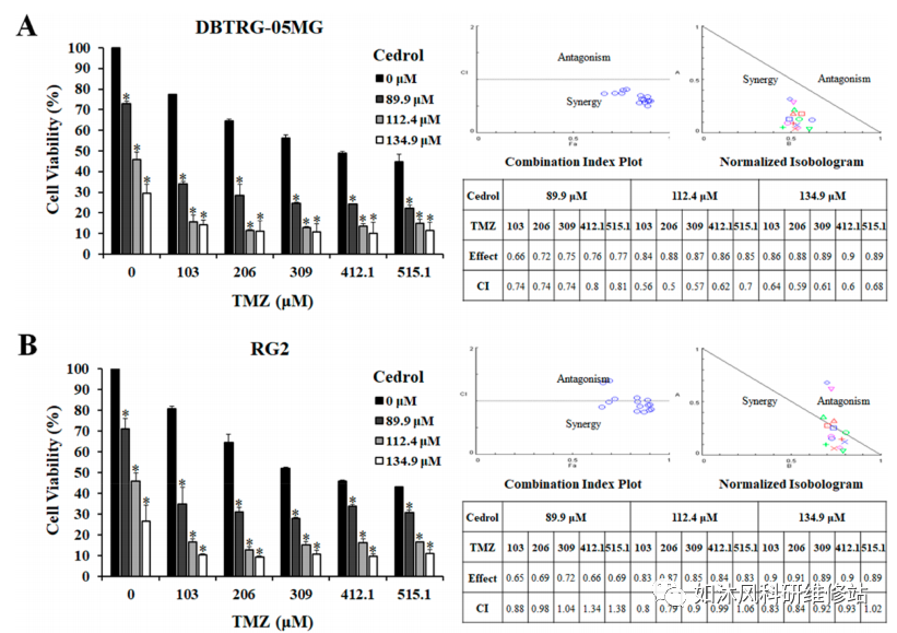 1 雪松酚cedrol和TMZ对DBTRG-05MG和RG2 GBM细胞系细胞活力的细胞毒性作用。