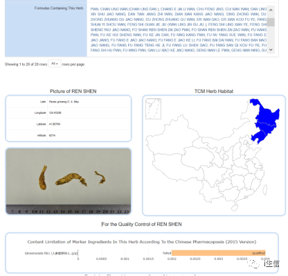 在搜索框中中输入目标中药,比如“ren shen”,点击进入人参的详细介绍,成分、靶点、疾病和复方信息都有,且每个条目都可以打开。并且还有人参的图片、产地和质量控制信息,以及每个成分对应的靶点信息。