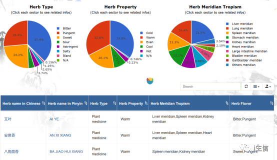 点击“Herbs”进入中药页面总览,ETCM将402味中药的性味归经进行了统计分析,并且显示了所有中药的信息总表,图片和表格都可以导出。