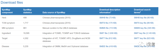 如果我们需要下载网站所有信息,可以点击“Download”,SymMap提供6类元素所有的下载信息,大家可以下载下来,综合其他的数据库进行筛选。