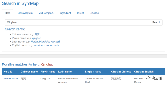 点击“Search”,可以搜索中药、中医症状、西医症状、化合物、靶点和疾病。比如输入“qinghao”,下方显示青蒿的ID、中文名、拼音、拉丁名、英文名和中药分类等。