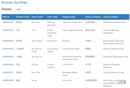 从“Browse”中点击进入,用户可以浏览所有草药、中医症状、西医症状、化合物、靶点和疾病,并通过点击SymMap ID详细查看某一项的分类信息和网络图。