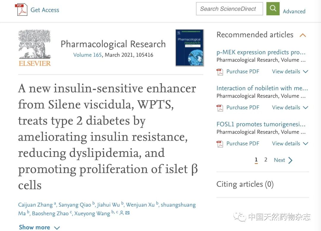瓦草五环三萜皂苷(WPTS)是新发现的胰岛素敏感性增强剂。它是一种强大的降血糖化合物,源自瓦草,具有与胰岛素相似的降血糖作用。它可以迅速降低血糖水平,在给药后3天内使其恢复正常。但是,其作用机理与胰岛素完全不同。因此,我们旨在确定WPTS对2型糖尿病的药理作用和活性机制,以阐明其迅速起效的主要原因。结果表明,WPTS可以有效改善KKAy糖尿病小鼠的胰岛素抵抗。比较转录组学表明,WPTS可以上调胰岛素抵抗相关基因的表达,例如葡萄糖转运蛋白4型(Glut4),胰岛素受体底物1(Irs1),Akt和磷酸肌醇3-激酶(PI3K),并下调脂质的表达代谢相关基因,例如单酰基甘油O-酰基转移酶1(Moat1),脂肪酶C(Lipc)和鞘磷脂磷酸二酯酶4(Smpd4)。结果表明,差异表达的基因可以通过PI3K / AKT代谢途径调节脂质代谢,值得注意的是,发现WPTS通过PI3K / AKT途径上调了Glut4的表达,降低了血糖水平,并减弱了胰岛素抵抗。Q-PCR和western blotting分别在mRNA和蛋白质水平上进一步验证了转录组学结果。我们认为,WPTS可以通过改善糖尿病KKAy小鼠的脂质代谢和胰岛素抵抗来实现快速降血糖作用。WPTS可能是治疗糖尿病的非常有前途的候选药物,值得进一步研究。 该项研究结果以“A new insulin-sensitive enhancer from Silene viscidula, WPTS, treats type 2 diabetes by ameliorating insulin resistance, reducing dyslipidemia, and promoting proliferation of islet β cells”为题已在线发表于国际药理学权威期刊《Pharmacological Research》(IF=5.893),博士研究生张彩娟为该论文第一作者,中药学院中药资源与鉴定系王学勇教授为通讯作者。