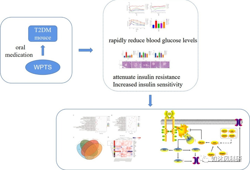 胰岛素是目前公认强效降血糖药物,然而针对2型糖尿病(T2DM)严重胰岛素抵抗时,单用胰岛素降糖效果却往往不理想。北京中医药大学中药学院团队,从中药瓦草中发现了WPTS成分,能够快速降低严重胰岛素抵抗模型小鼠的血糖,其降血糖速度明显优于二甲双胍和罗格列酮,并能显著改善小鼠脂代谢。该团队从整体动物实验结合转录组学技术系统阐释了WPTS在治疗2型糖尿病的主要疗效及作用机制。药效学研究显示,WPTS在灌胃给药3天后即可快速降低2 型糖尿病KKAy小鼠血糖至正常水平,并能够显著改善胰岛素抵抗,增强胰岛素敏感性,减轻糖尿病小鼠的病理损伤等。深入机制研究发现,WPTS通过PI3K/AKT代谢途径调节脂质代谢,从而迅速改善胰岛素抵抗,通过上调Glut4的表达快速降低血糖水平。