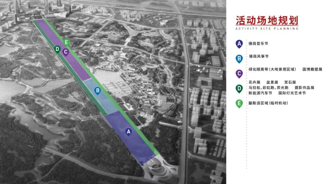 而原骆岗机场将会在园博会期间以极其靓丽的姿态重新绽放。除了城市更新展区(园博小镇)、生态园林展区满足广大市民、游客休闲体验、商业配套服务以外,还将会利用原骆岗机场遗留的13万平方米停机坪打造科技科技展,以及开通直升机观光旅游航线,利用3.3公里长机场跑道开展系列活动,打造一座永远有变化、永远不落幕的跑道秀场与一场汇聚创新科技元素的科技盛宴。