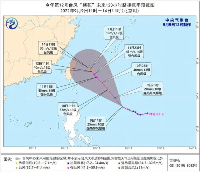 9月12日,中央气象台继续发布台风蓝色预警,今年第12号台风“梅花”(强台风级)的中心12日上午9点钟位于浙江省舟山市南偏东方向约680公里的台湾以东洋面上。