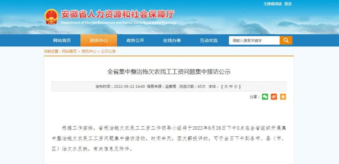 根据工作安排,省根治拖欠农民工工资工作领导小组将于2022年9月26日下午3点在全省组织开展集中整治拖欠农民工工资问题集中接访活动,时间半天。因欠薪投诉的,可于当日下午到各市、县(市、区)治欠办反映,有关信息见附件。