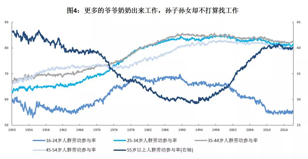从统计上看,美国年轻失业人群退出劳动力市场(底部蓝线,永久性失业、啃老),而大量老年人出来找工作(深蓝线,没有储蓄、老无所依)。