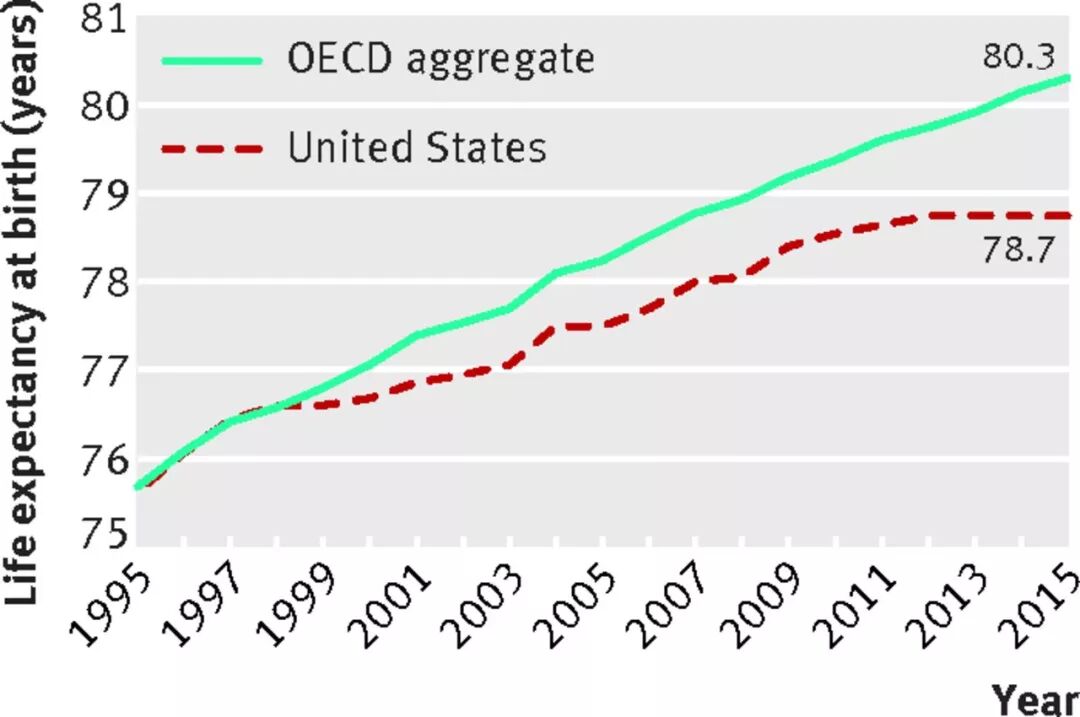 经合组织成员国人均寿命(绿线)和美国人均寿命(红线)的对比