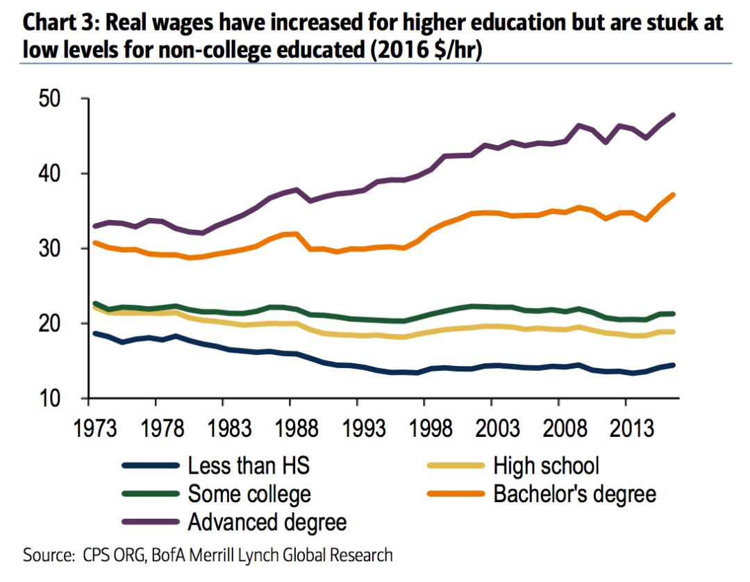 可是正如下图,没有大学学位的美国人收入比40年前更糟糕。