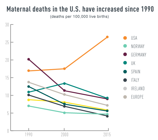 美国的产妇死亡率,它远高于其他发达国家,也高于中国(2017年中国产妇死亡率19.6/10万),并呈现上升趋势。