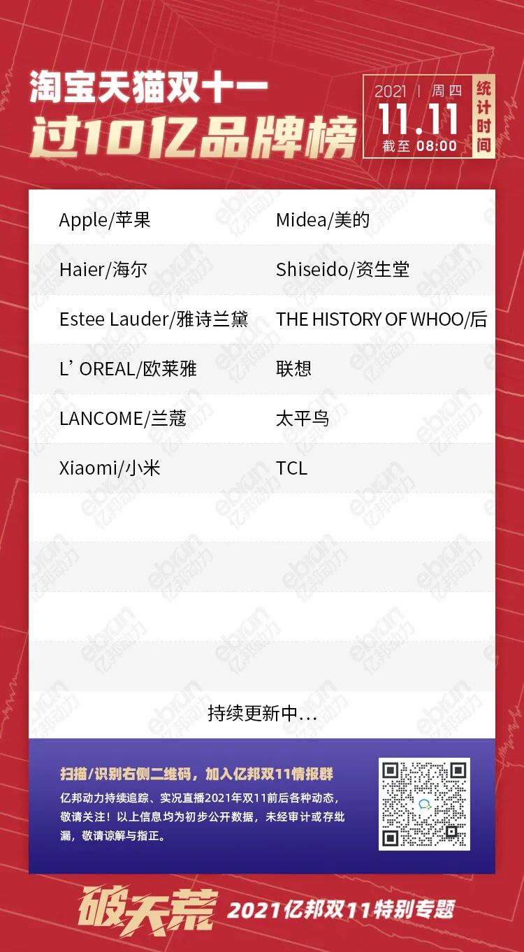 从11月1日0点到11日0点45分,已有382个品牌在天猫双11的成交额超过1亿元。其中包括华为、鸿星尔克等人气国货品牌,也有苹果、欧莱雅等国际品牌,百雀羚、回力等老字号,蕉内、添可等新品牌也跻身成交额过亿之列。