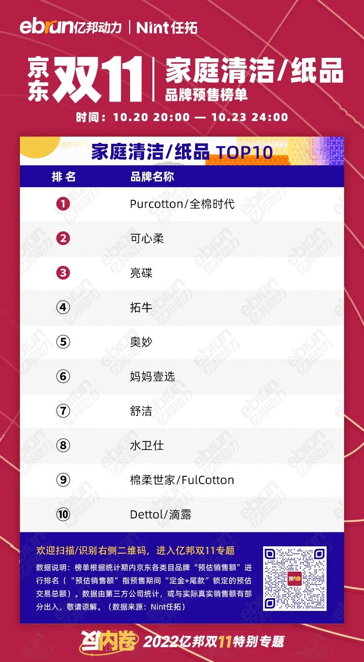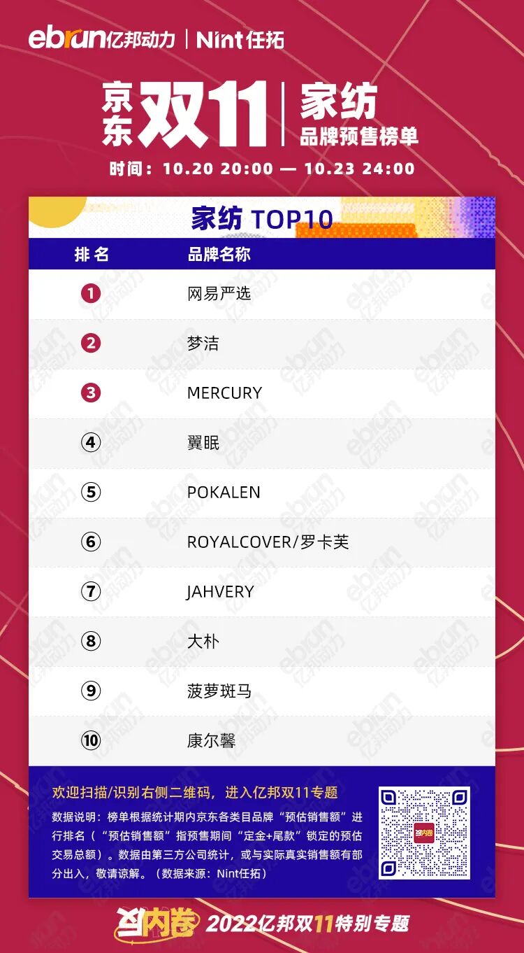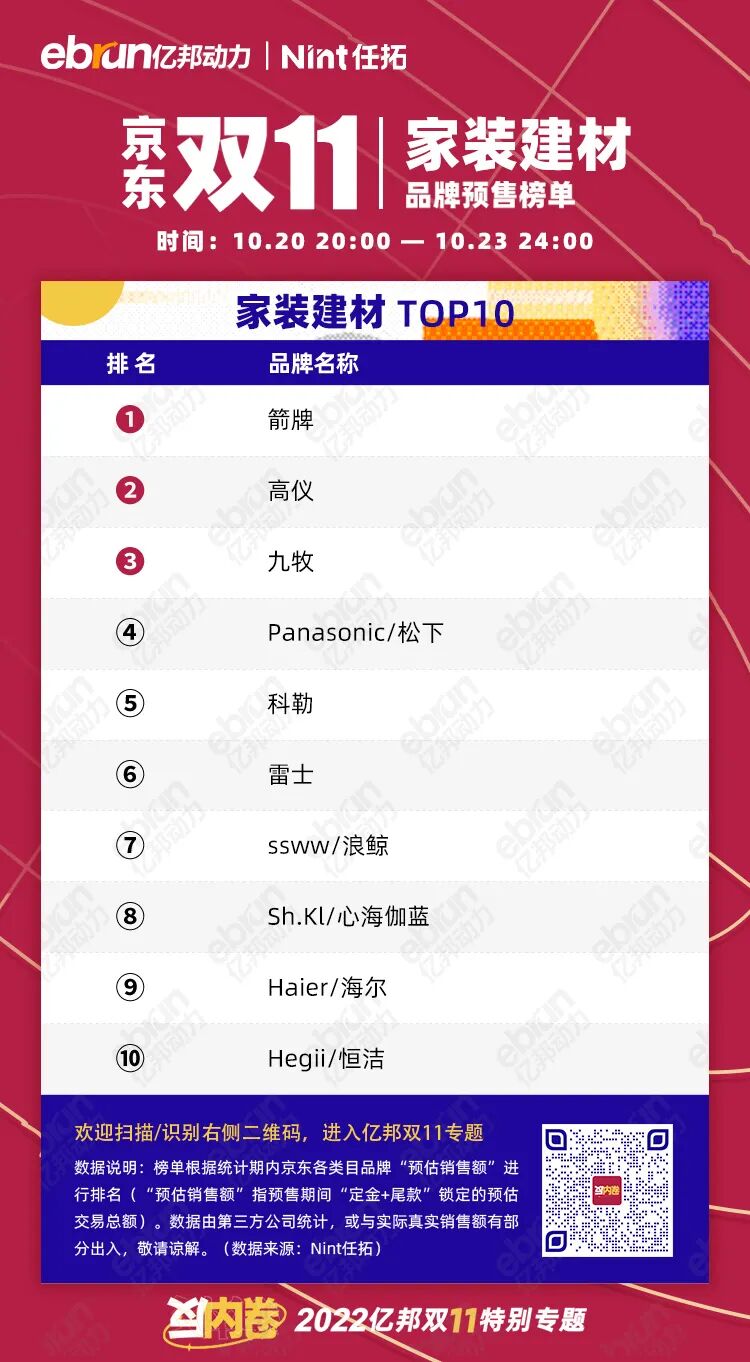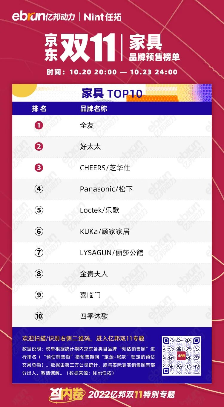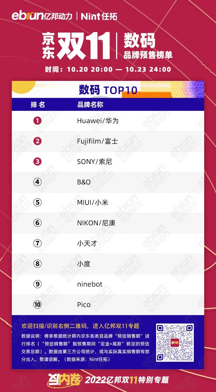 榜单根据统计期内京东各类目品牌“预估销售额”进行排名(“预估销售额”指预售期间“定金+尾款”锁定的预估交易总额)。数据由第三方公司统计,或与实际真实销售额有部分出入,敬请谅解。(数据来源:Nint任拓)